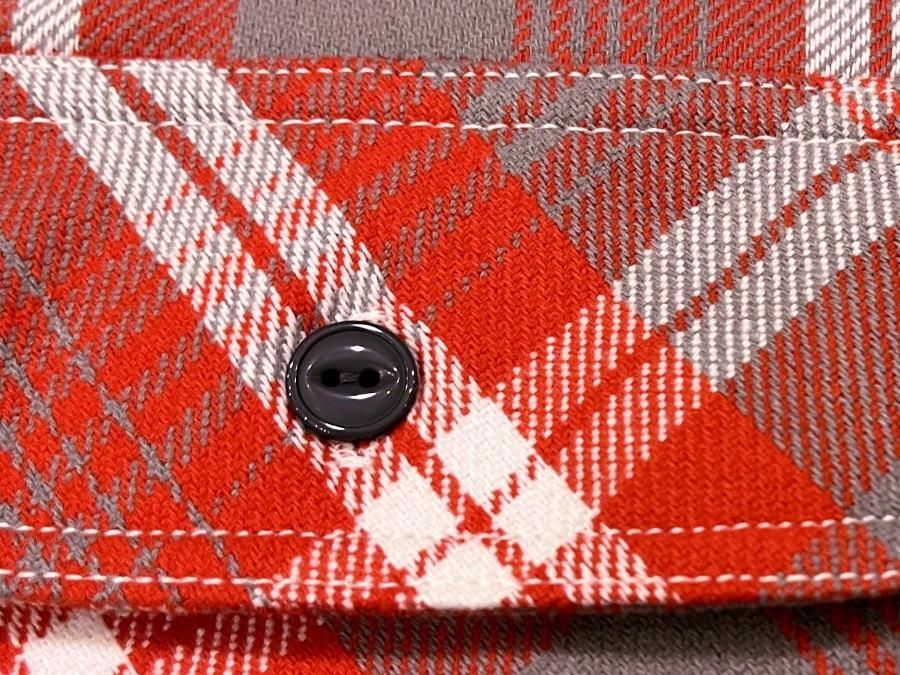 ボタン留めフラップ付きのポケットが両胸に付きます。猫目ボタンや2本針ステッチも良い雰囲気です。厚手のヘビーネルを使用。着込むほどに増していく色落ち感や風合いなど経年変化も楽しみです。