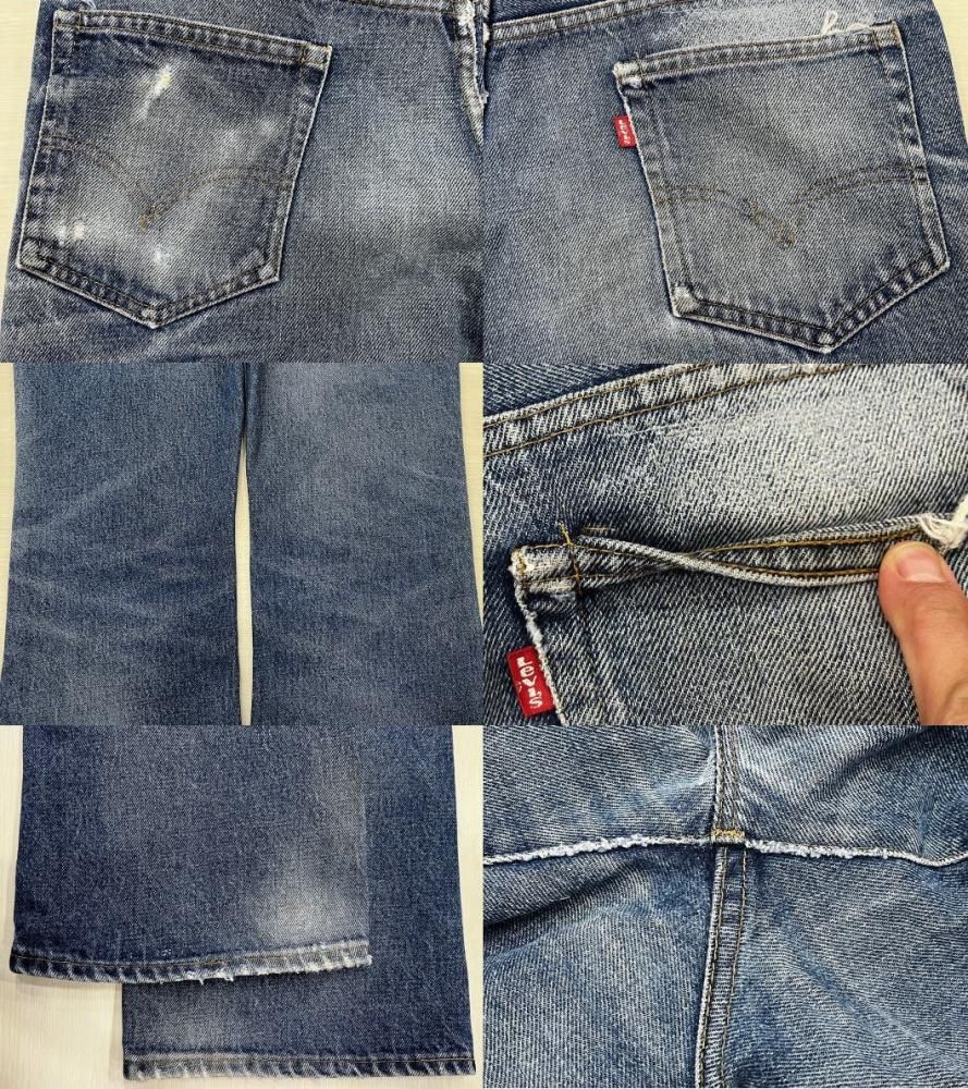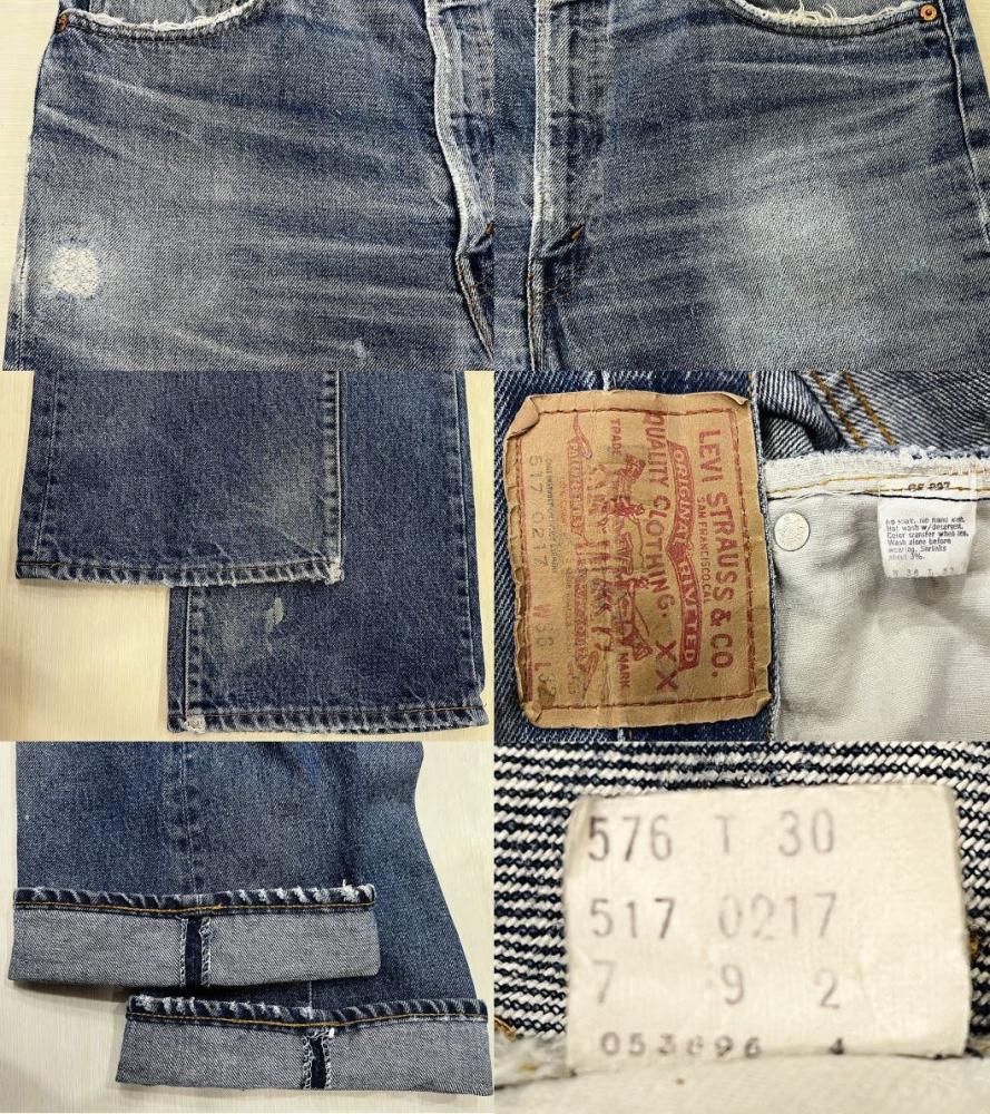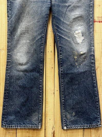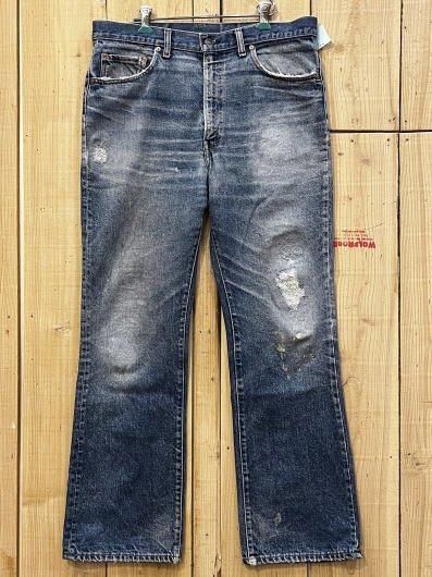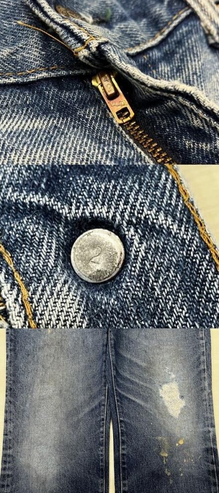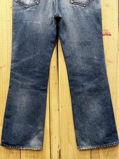 517-66後期ヴィンテージブーツカットです。タロンジッパーなどやはり66は良い雰囲気ですね。まるで芸術品最高な色です。リアルワーカーの穿き込まれた迫力ある良い色落ちで膝裏のクモノスや激ヒゲ、アタリなどいい感じです。膝にリペアその他数か所リペアが各所にありますがしっかりとリペアされております。なかなか出てこない1本です。